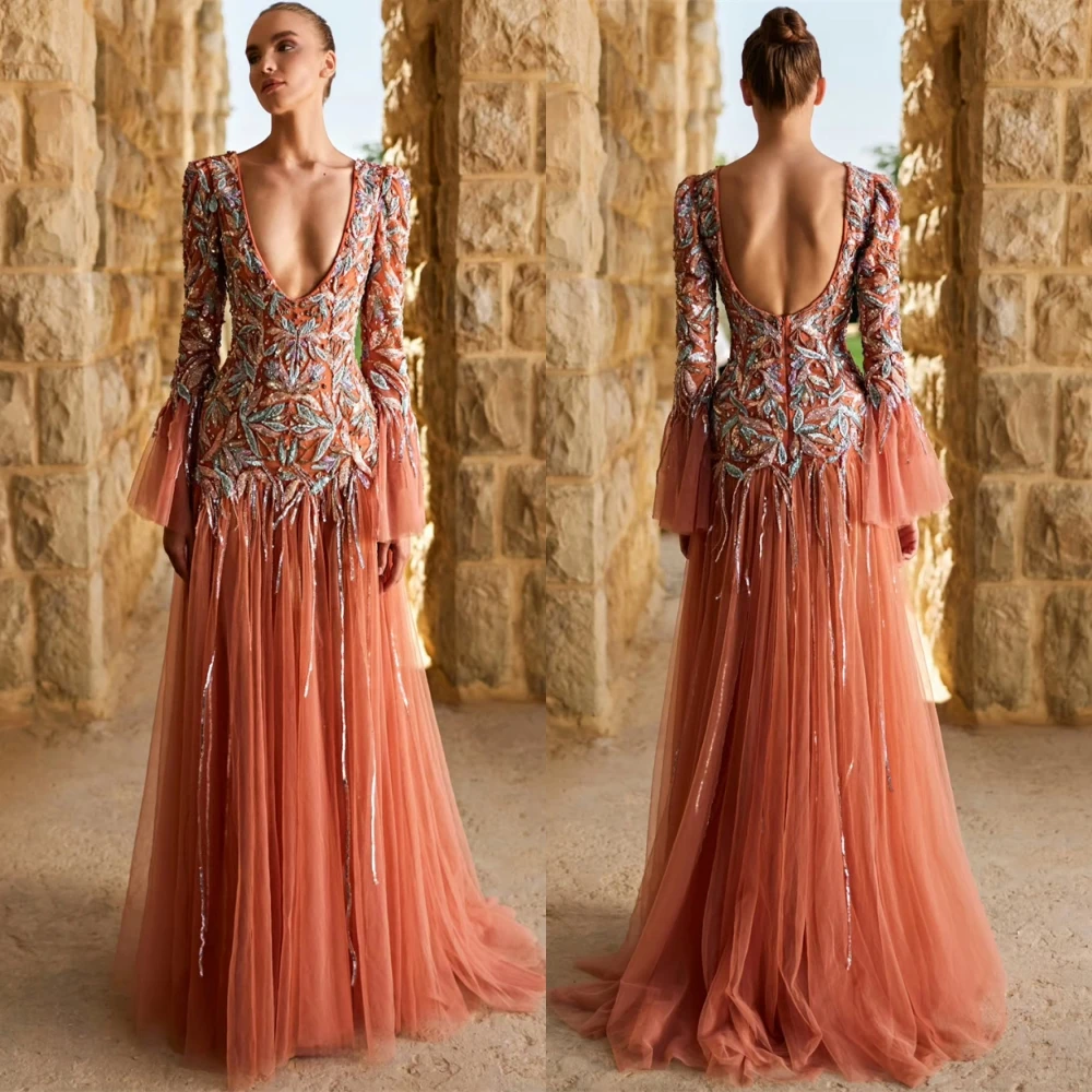 Customized Soft Organza V-Neck Evening Dress Exquisite Sequined Prom Dresses Temperament Long Sleeves Special Occasion Gowns