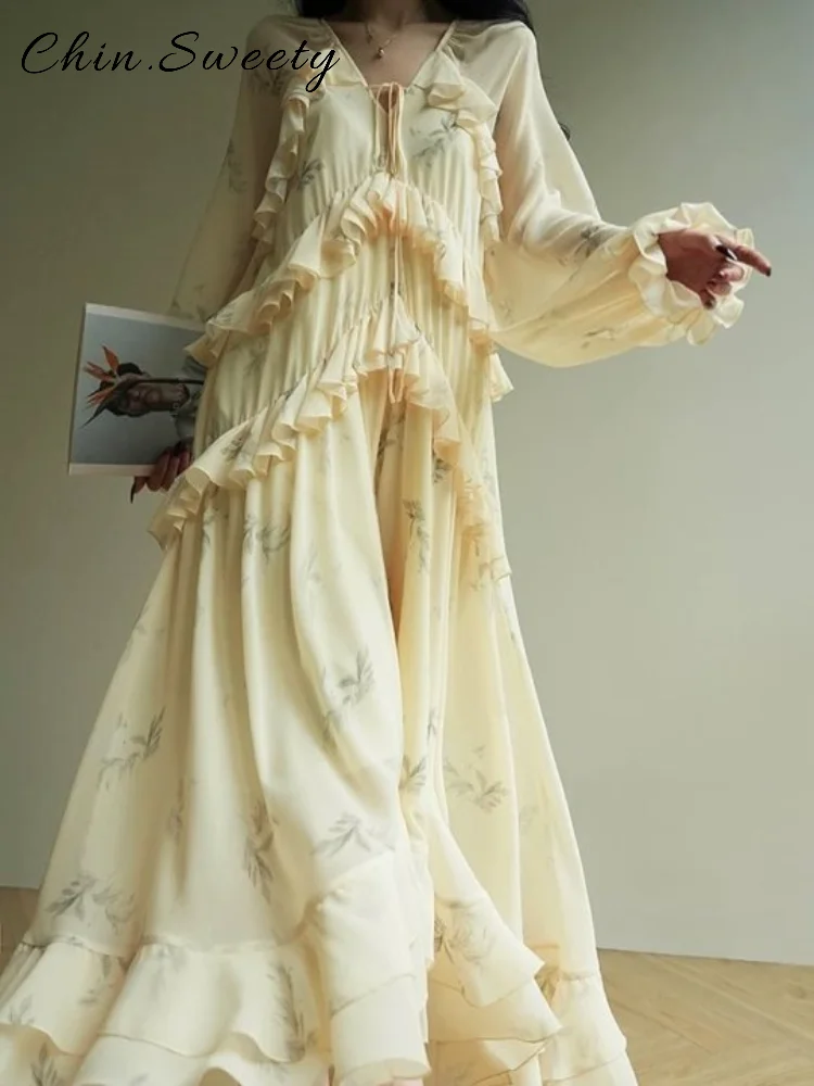 Elegant Printed Cascading Ruffles Long Dress Women Lace Up V-neck Full Sleeve A-line Dresses 2025 Early Autumn High Street Robes