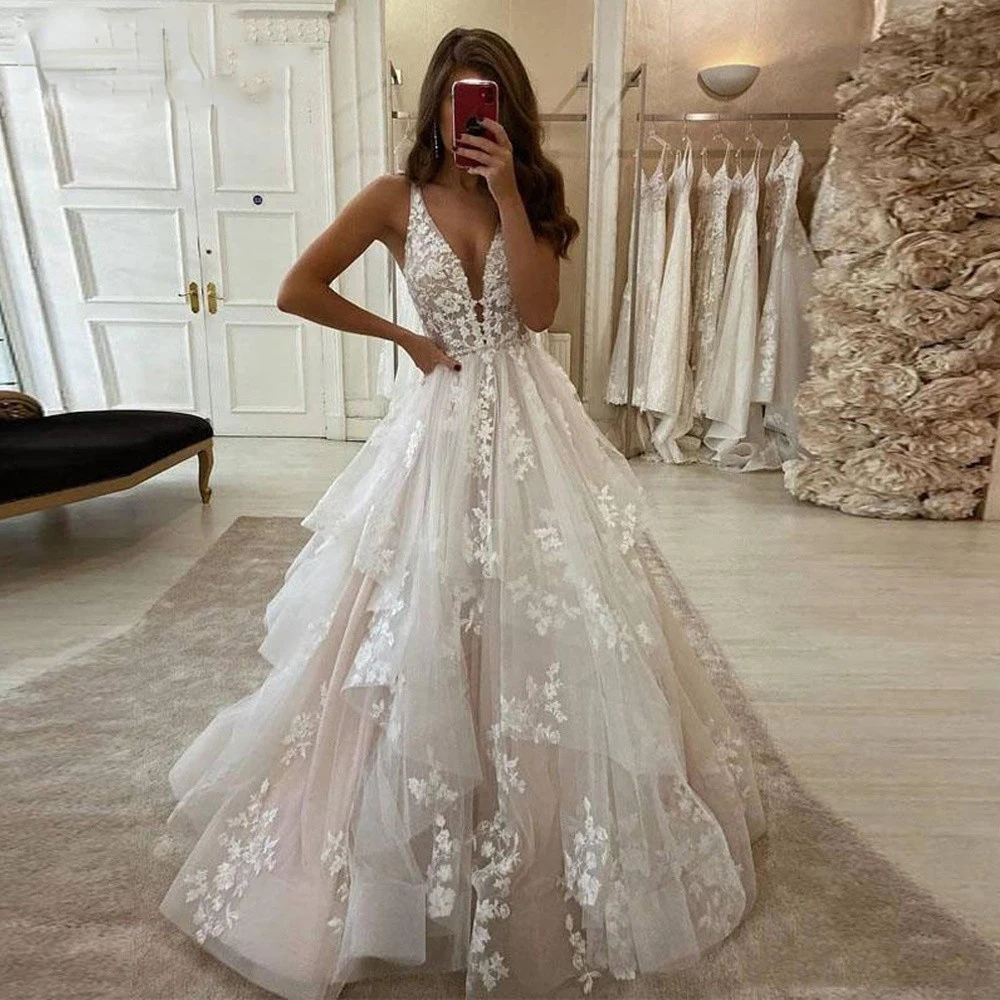 A-Line V-Neck Boho Wedding Dress Puffy Tulle Princess Bridal Dresses Plus Size Lace Appliques Backless Long Wedding Party Gowns  Read more