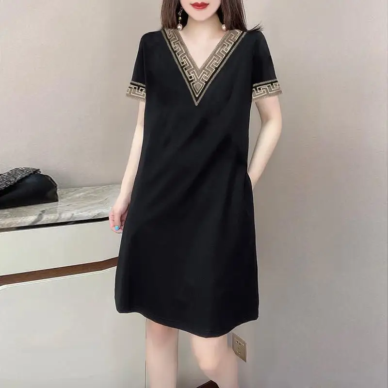 2023 Summer New Korean Loose Hollow Out Patchwork V-Neck Lace Short Sleeve Black All-match Pockets Midi Dress for Women's