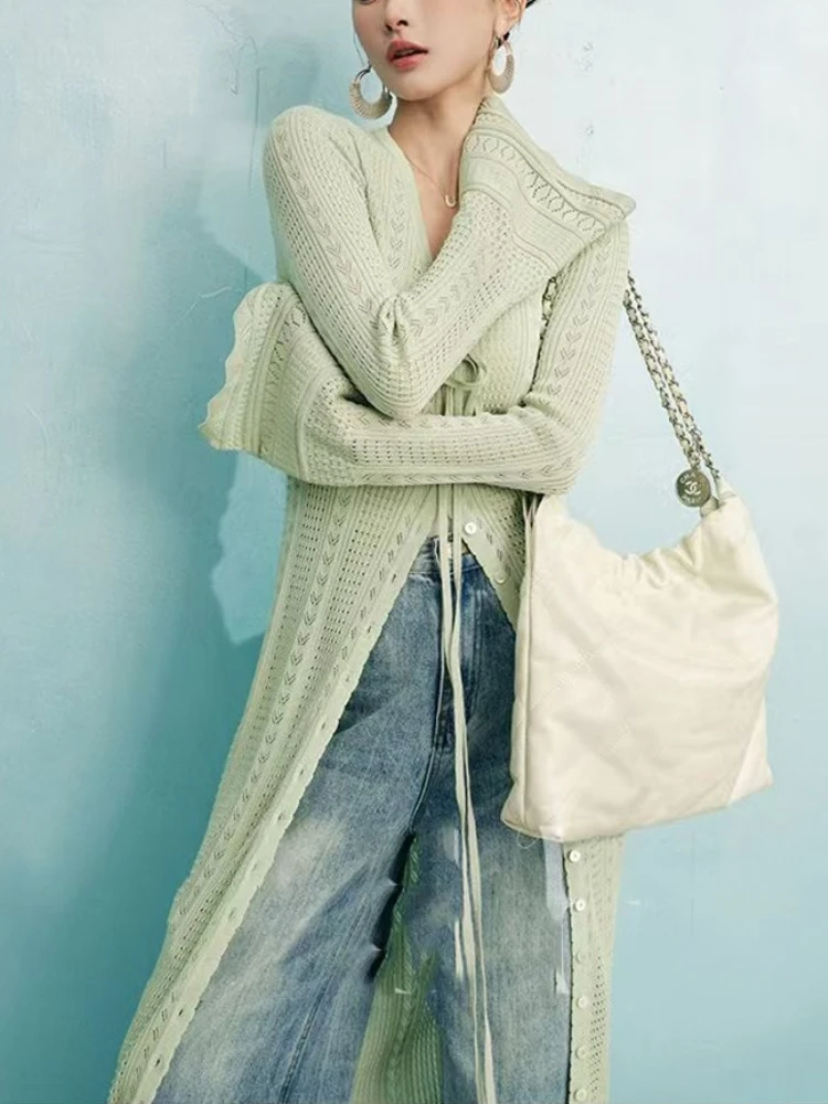 Trendy Flared Sleeves V-neck Lace Hem Maxi Dress Trench Coat Women Solid Lace-up Robe Cover Up Long Dress Slim Knit Streetwear  Read more