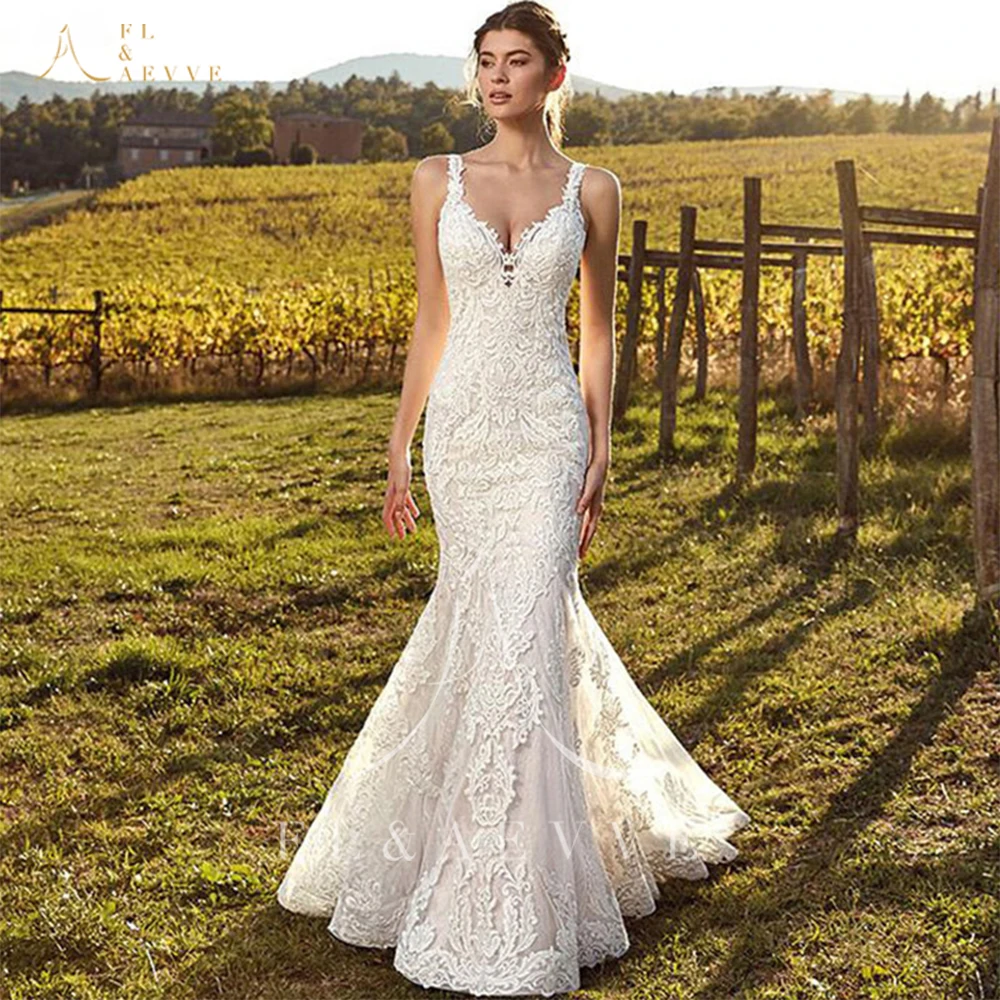FL&AEVVE Lace V-Neck Wedding Dress Spaghetti Straps Lace Beach Bridal Dresses Customized Wedding Party Gown vestidos de novia