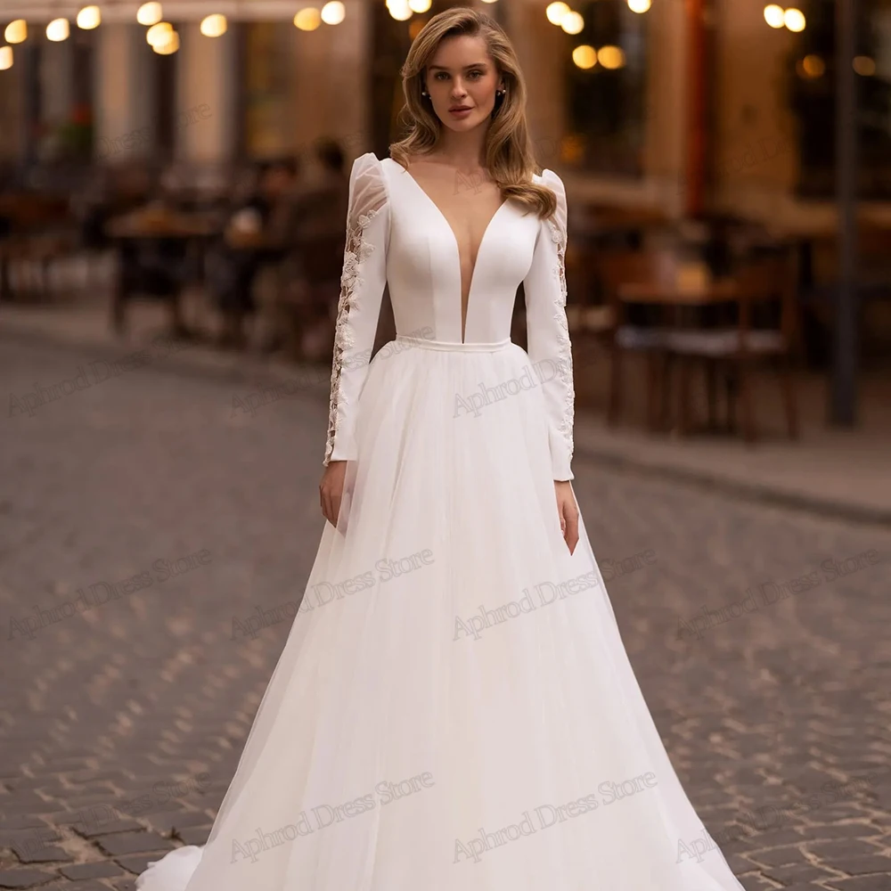Modest Wedding Dresses A Line Satin Bridal Gowns Lace Appliques Full Sleeves Deep V Neck Glamorous Vestidos De Novia Customized  Read more