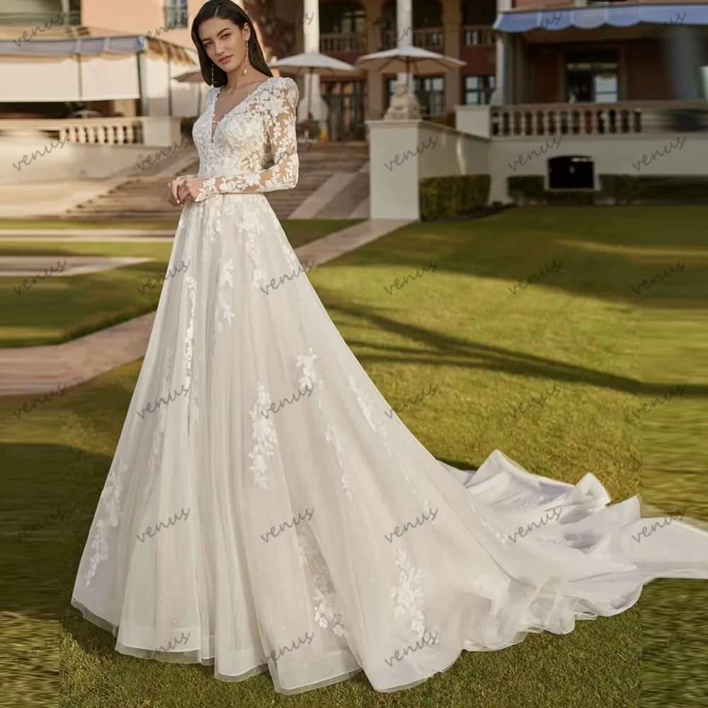 Modern Long Sleeves V-neck Lace Applique Bridal Grown A Line Wedding Dresses Custom Made 2025 Vestido De Noival