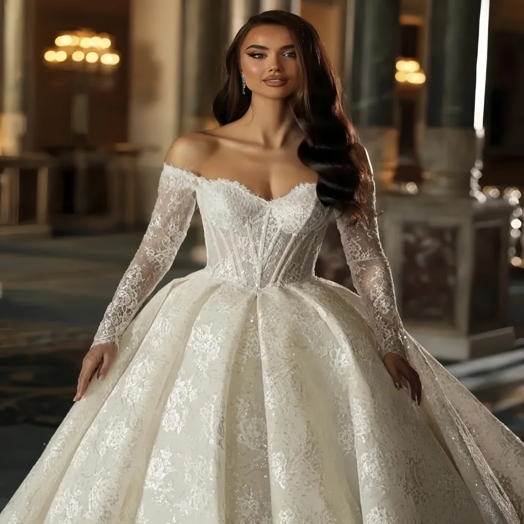 Customized Luxury Lace Wedding Dresses A Line Sequins V Neck Long Sleeves Wedding Gowns Bridal Gowns Robe Vestidos De Novia