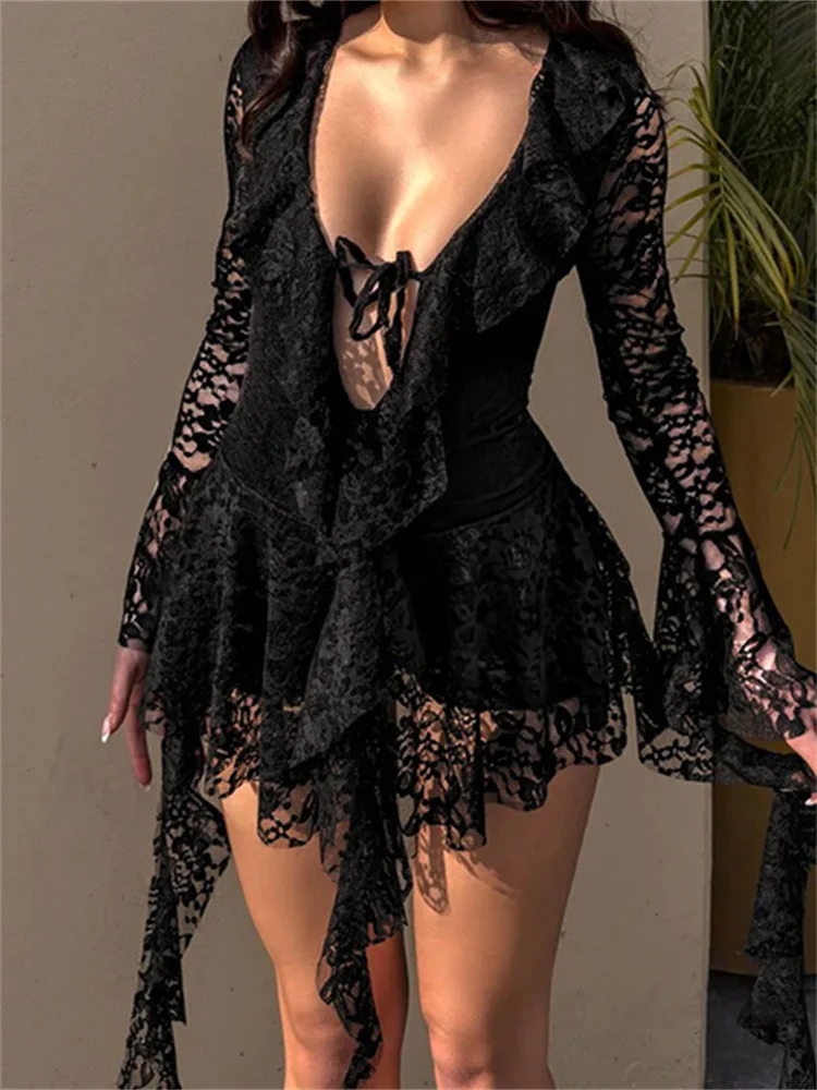 CHRONSTYLE Deep V-neck Front Tie-up Lace Mini Dresses for Women Long Sleeve See Through High Waist Tassels Dress Female Vestidos