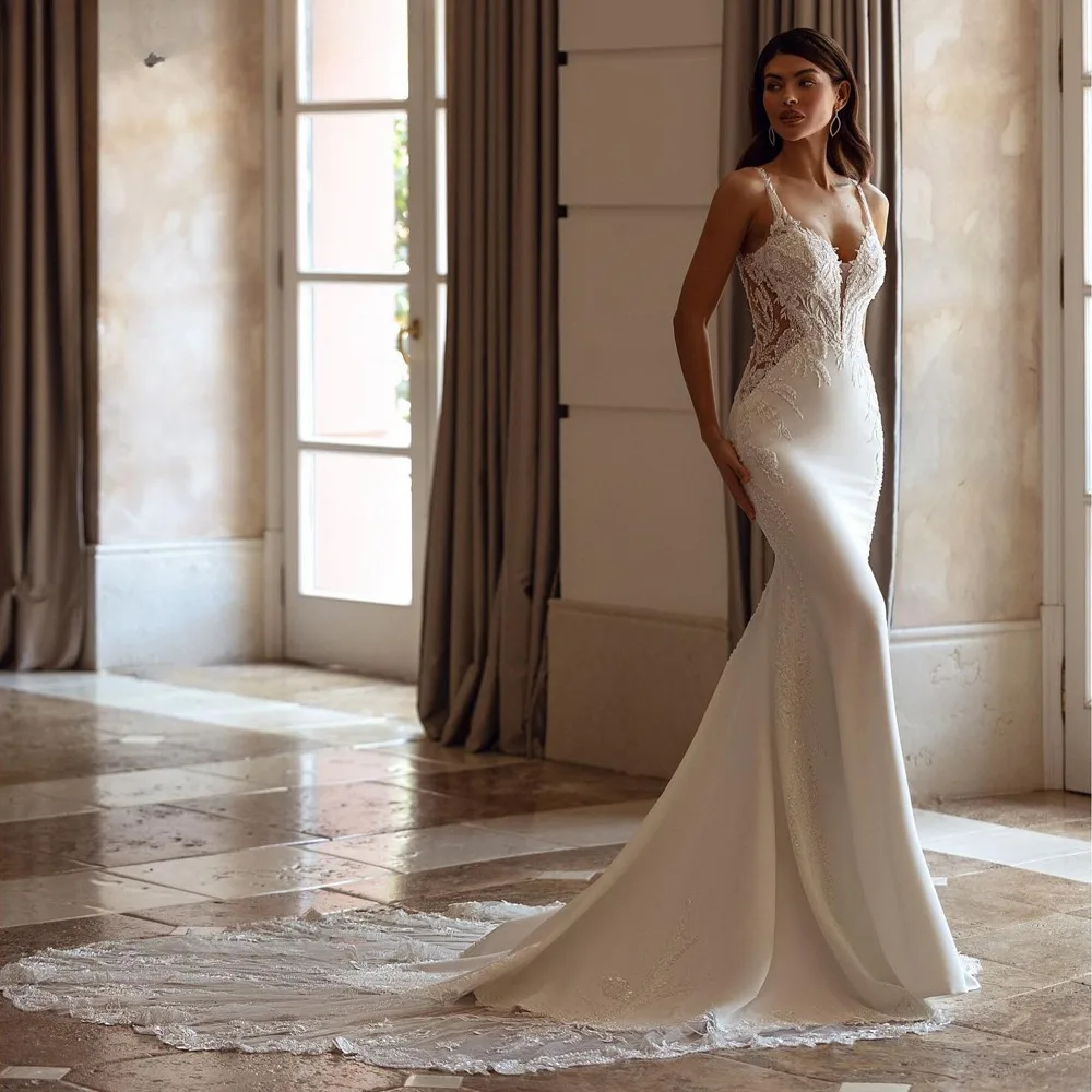 Luxury V-neck Mermaid Wedding Dresses for Women Spaghetti Straps Lace Appliques Robe De Mariee Backless Bridal Gown