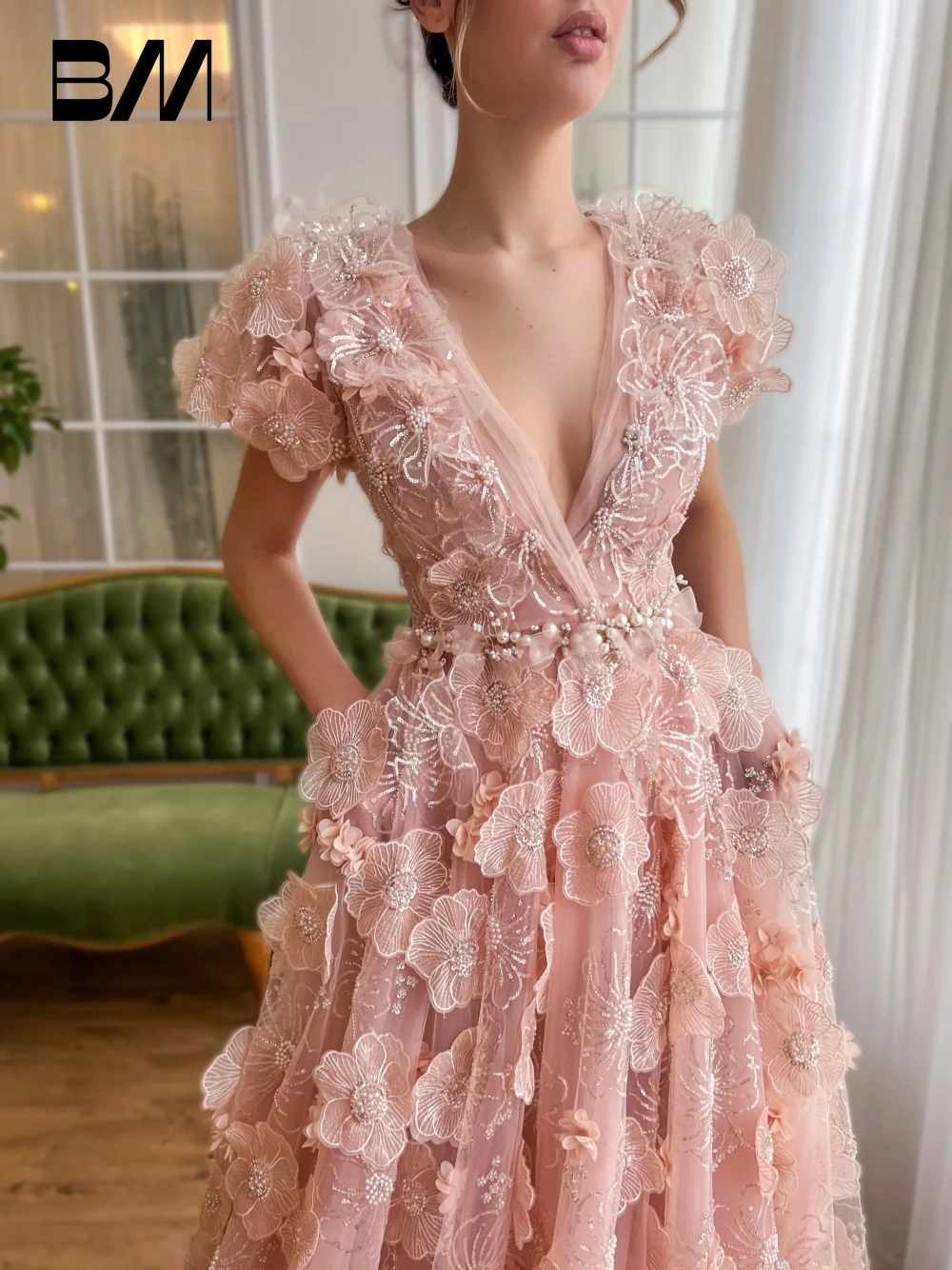 Rose Pink Lace 3D Flowers V Neck Prom Dress Pearls Evening Dresses Cocktail A-line Formal Events Customized Women Party Gown