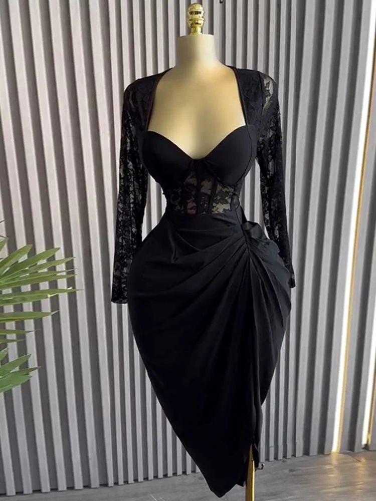 Female Black Sexy Evening Dress V Neck Square Collar Lace Long Sleeves High Waisted Dresses for Women Sping Classy Elegant Dress
