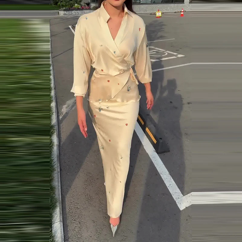 2025 Floral Print Two Piece Satin Set Women Lace-up Outfit Ladies Elegant Slim Lapel V-Neck Long Sleeve Blouse&Long Skirts Suit