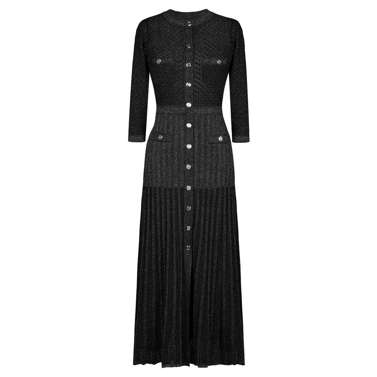 High Quality Fashionable Elastic Bright Silk Knitted Round Neck 7-inch Sleeve Single Row Button Lace Slim Fit Women's Dress