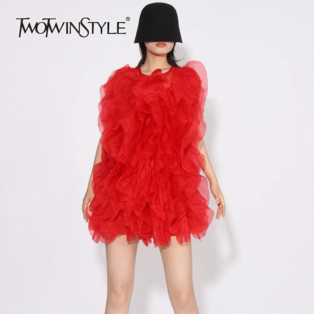 TWOTWINSTYLE Solid Patchwork Lace Up Mesh Dress For Women Round Neck Sleeveless High Waist Chic Formal Dresses Female Fashion  Read more