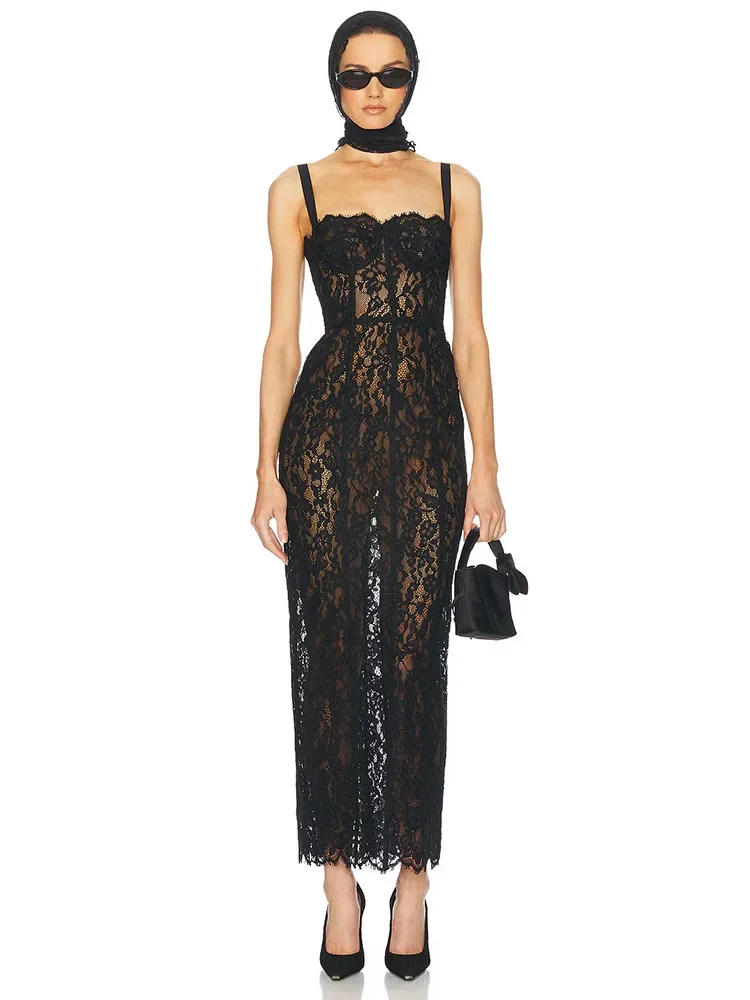 Sexy Spaghetti Strap Square Neck Lace Long Dress Women Black Floral Lace Sleeveless Bodycon Dresses Elegant Evening Celebrity