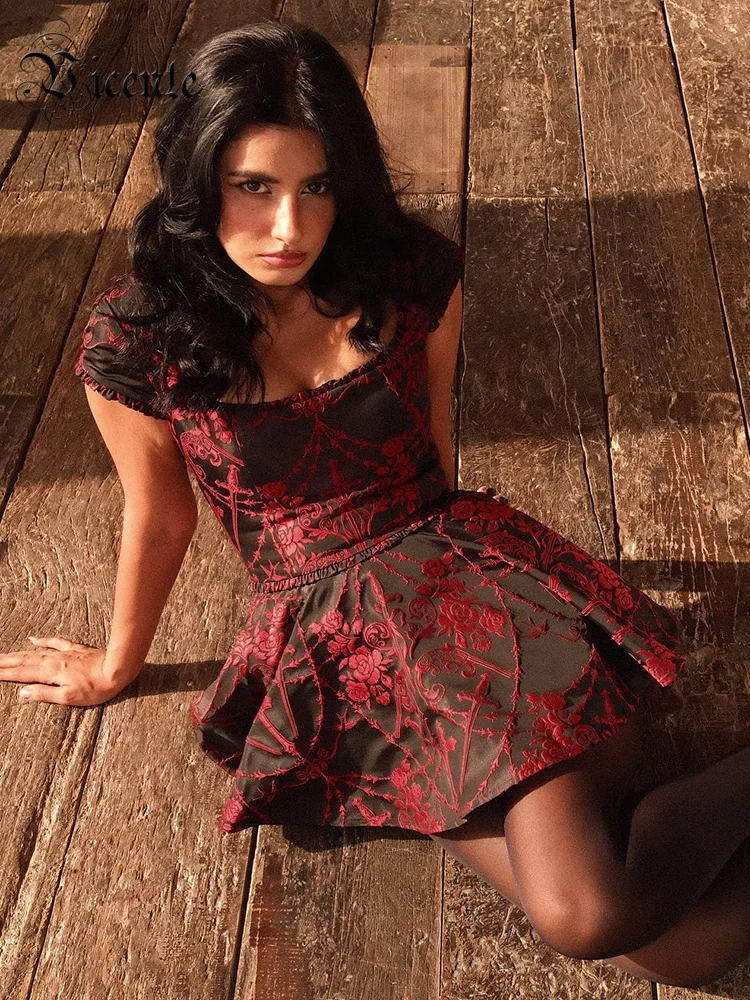 VC Vintage Black Style Red Embroidered Square Neck Mini Dress for Party Fashion Event