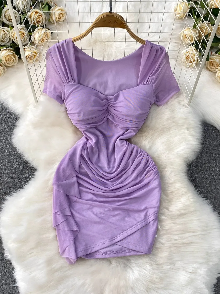 Foamlina Sexy Padded Square Neck Dress Womens 2025 Summer New Mesh Pleated Waist Slimming Bodycon Mini Dresses
