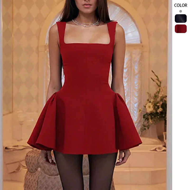 Women Red Solid Open Back High Waist Birthday Mini Party Dress Summer Party Elegant Square Neck Sleeveless A-line Evening Dress