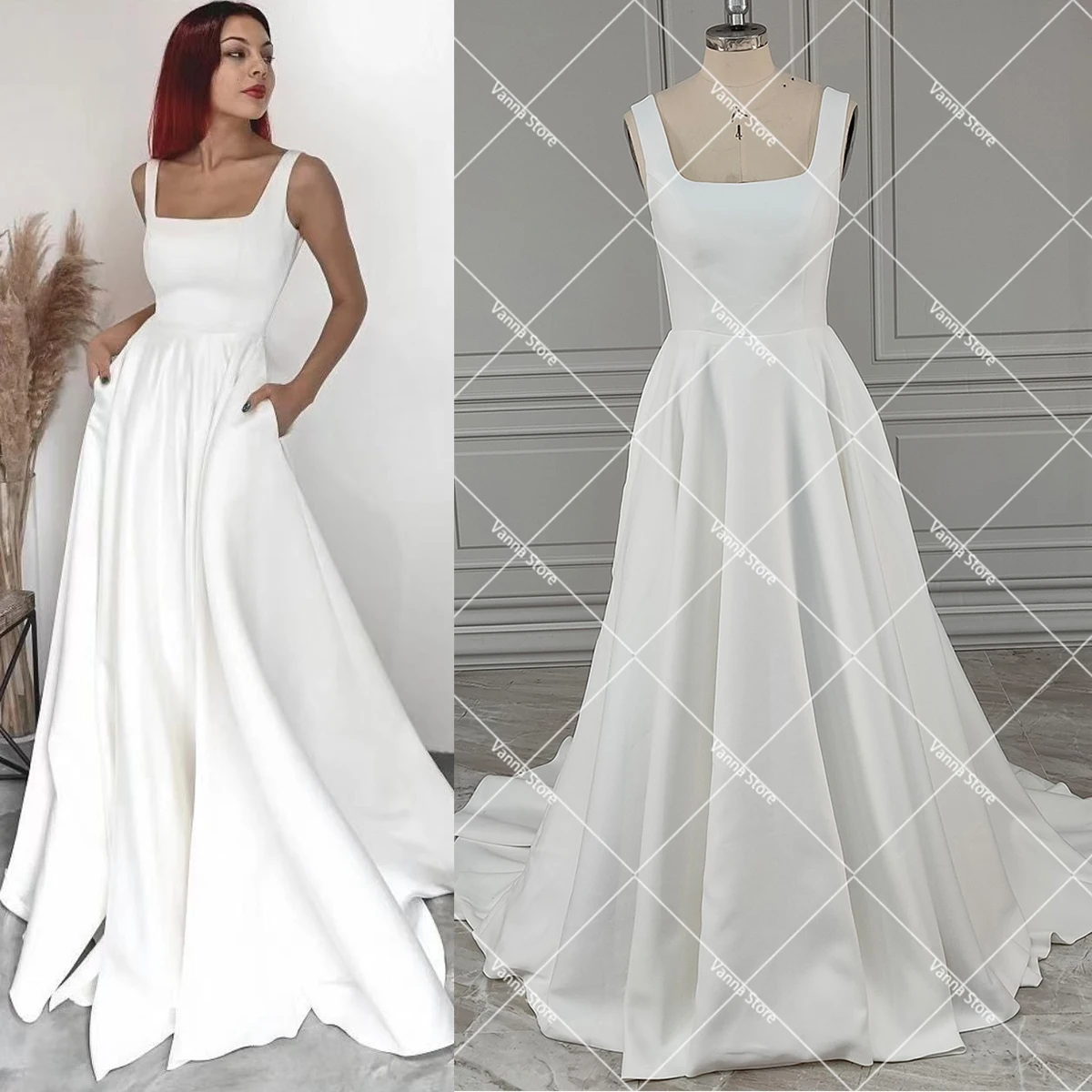 Elegant Matte Satin Square Neck Wedding Dress With Pockets Thick Customized Sleeveless Buttons Open Back A Line Bridal Gowns