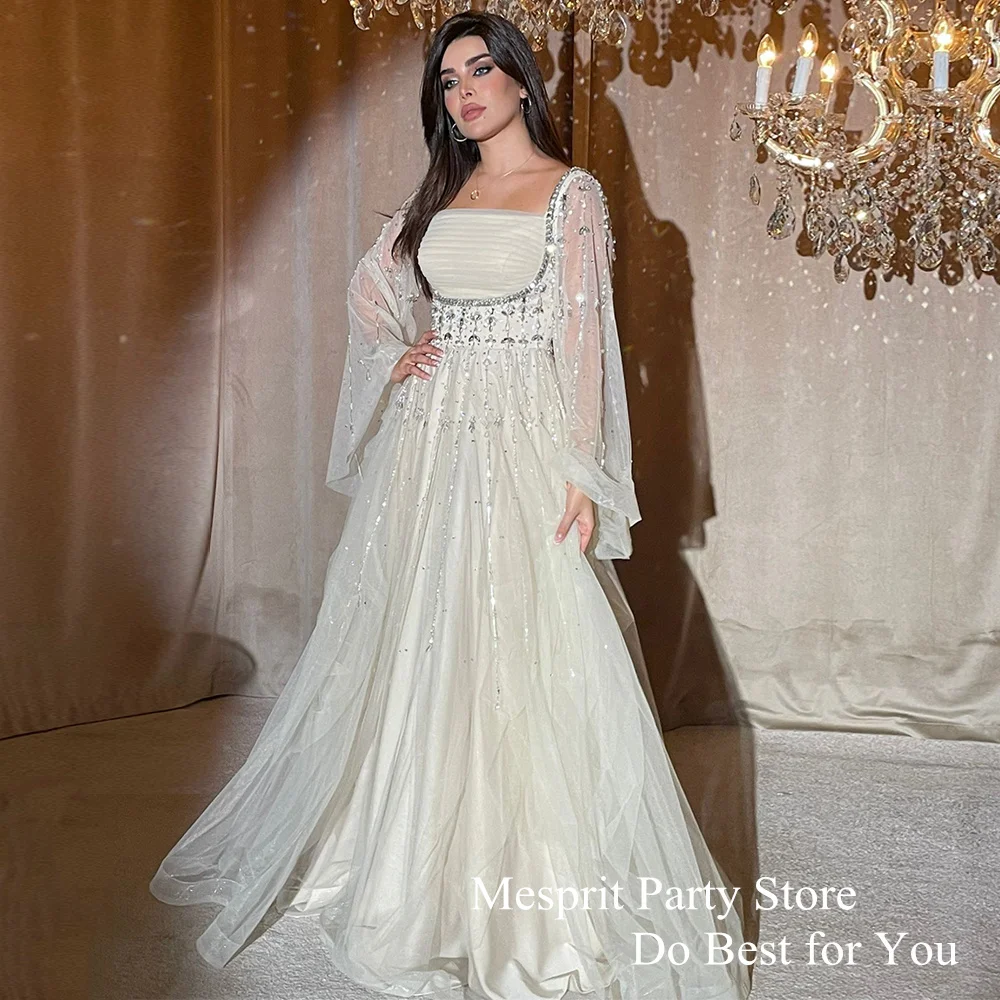 Stunning Saudi Arab Evening Dress Customized Flare Sleeves Square Neck Luxury Stones Crystals Arabic Prom Gown Party Dresses