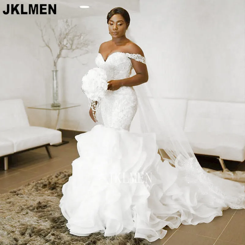 Real Photos Ruffle Organza Mermaid Wedding Dress Lace Beads Pearls Off-the-shoulder Trumpet Bridal Gown Custom Made
