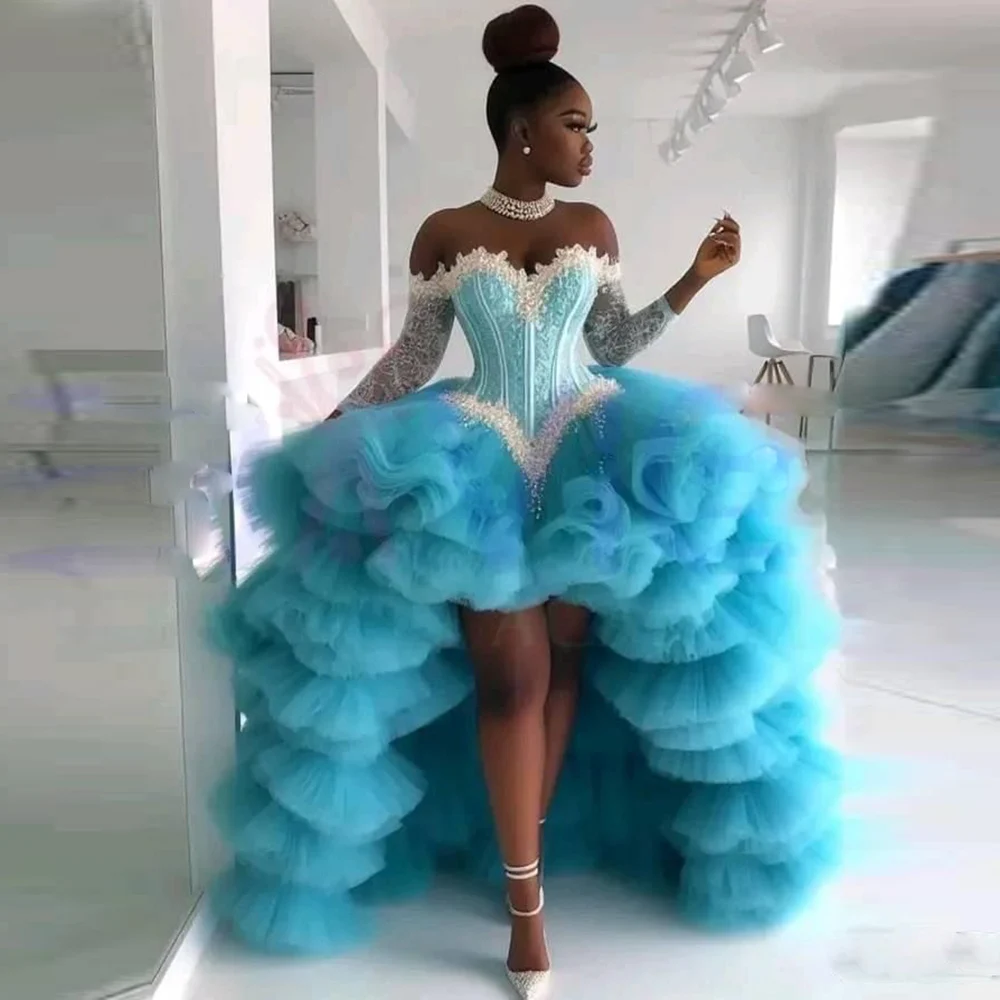 Blue Off The Shoulder Prom Dresses Lace And Tiered Tulle High Low Evening Gowns Aso Ebi Long Sleeves African Women Party Dress