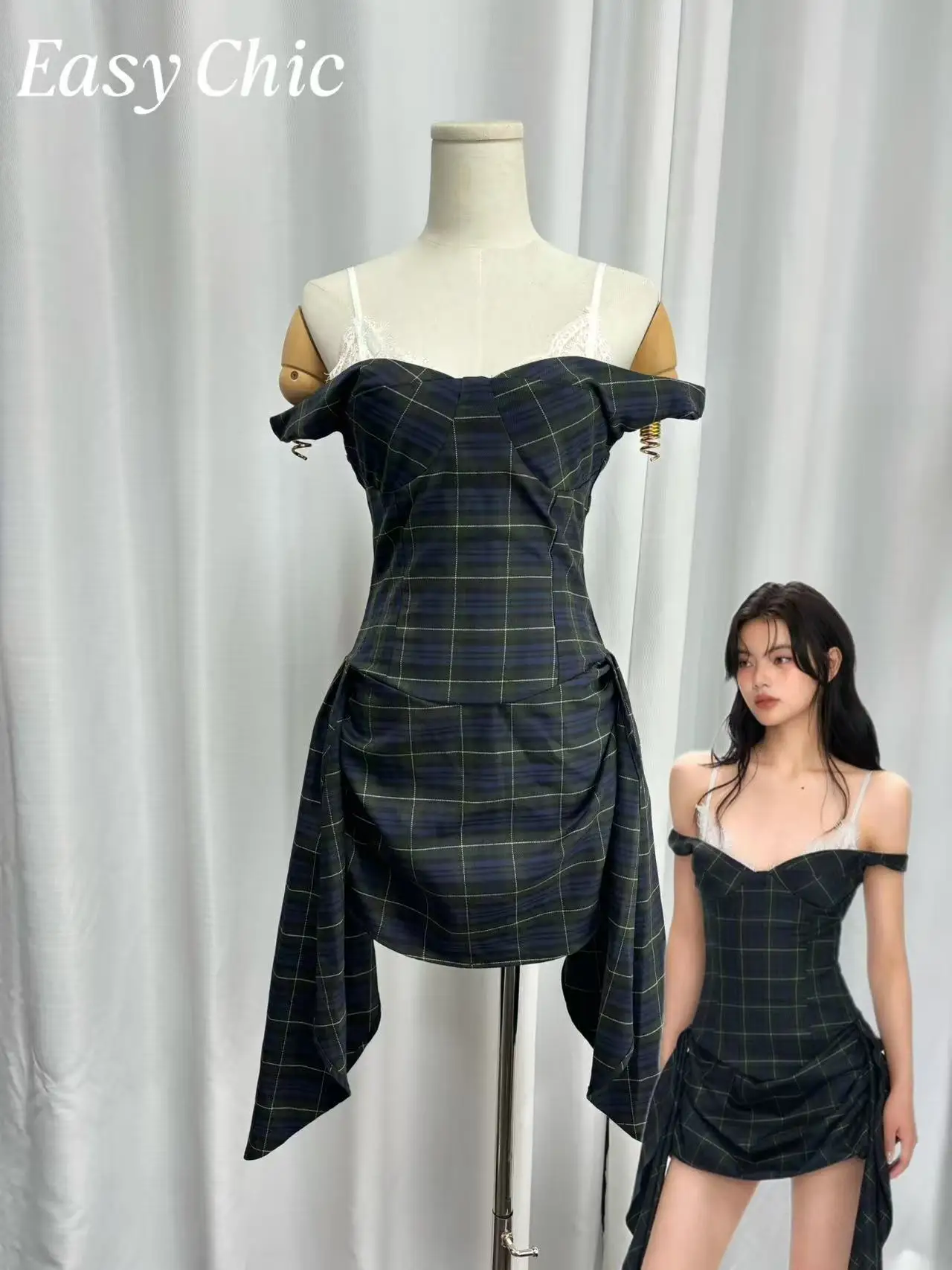 Women's Two Piece Look Off Shoulder Plaid Dress - Y2K Vintage Corset Ruched Mini Dress with Lace Trim