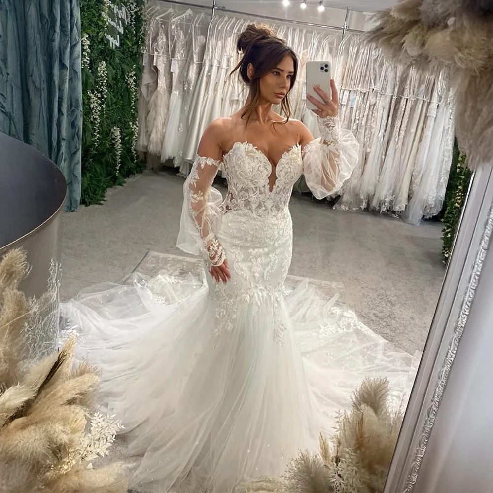Customized Lace Appliques Off Shoulder Mermaid Wedding Dress with Puff Sleeves Tulle Train Elegant Bridal Gown for Women