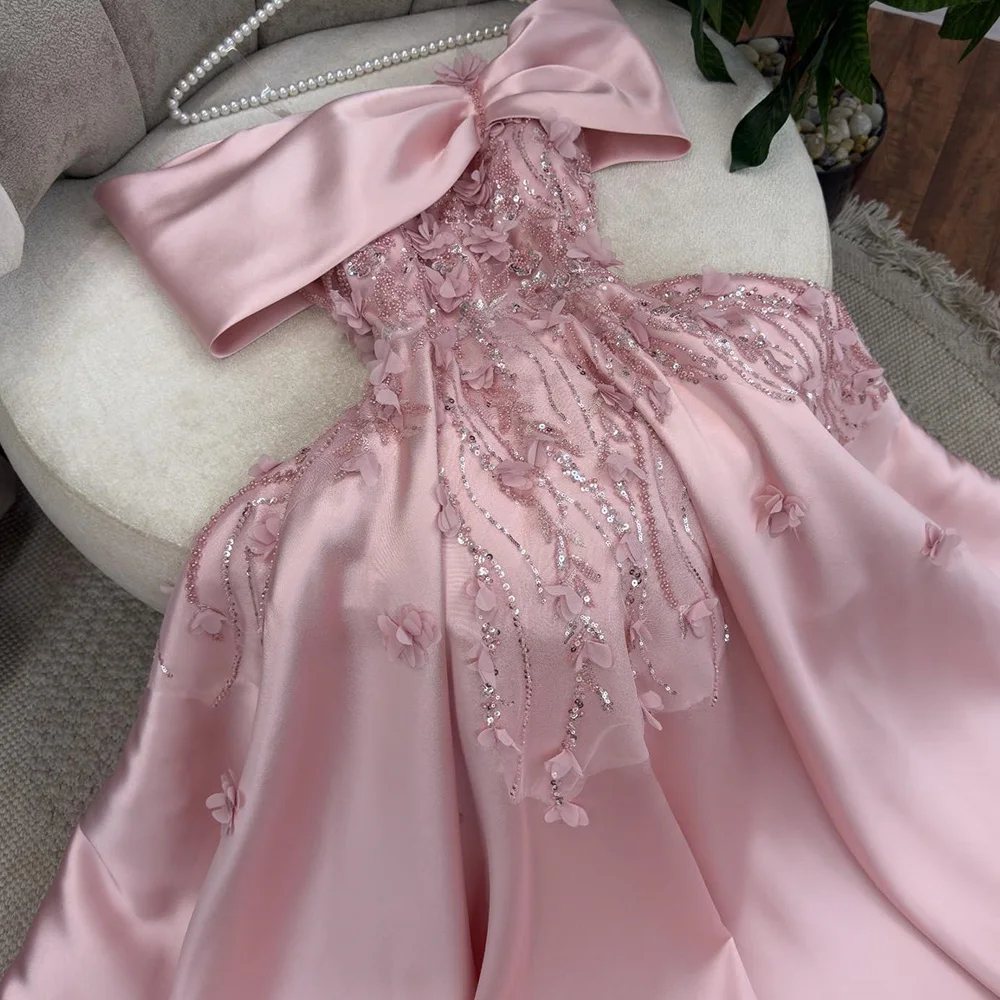 Customized Customized Exquisite Off the Shoulder Lace Sequined Appliques Evening Dress Elegant Pink Satin A-Line Saudi Arabia Pa