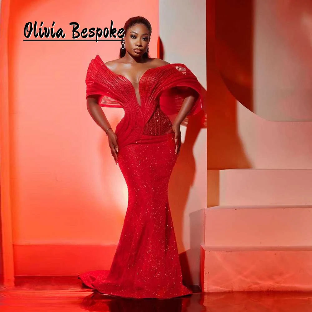 Impressive Red Beads Aso Ebi Evening Dresses 2024 Ruched Off The Shoulder African Lace Up Mermaid Wedding Party Dress Customized