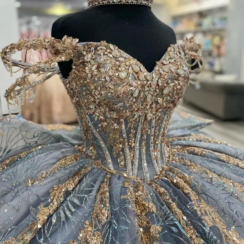 Gray Amazing Shiny Quinceanera Dresses Off the Shoulder Sequin Applique Lace Beads Crystal Party Birthday Ruffle16 Dress
