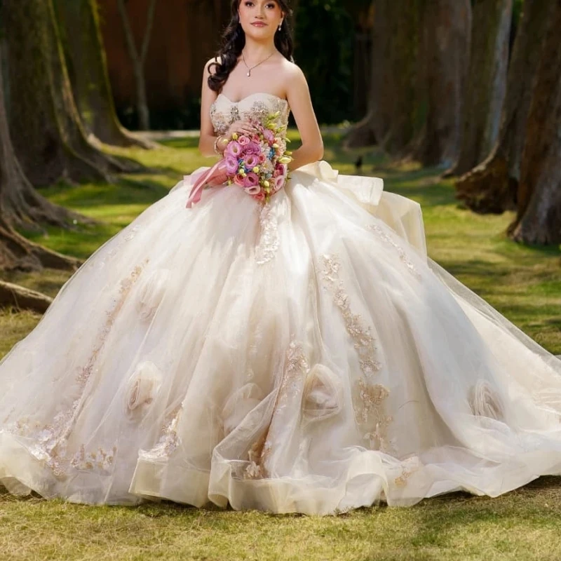 Beige Quinceanera Dresses Ball Gown Off The Shoulder Applique Lace Beading Crystal Tull Corset Sweet 16 Dress Vestidos 15 De  Read more