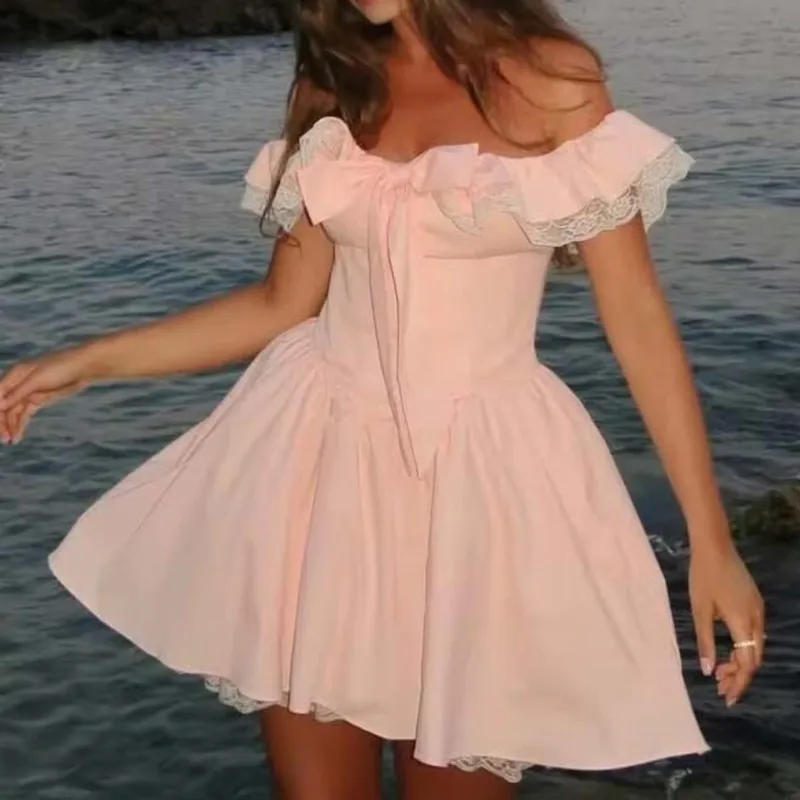 Sexy Off Shoulder Elegant Pink Party Mini Dresses For Women Lace Spliced Bow Ball Gown Summer Dress Birthday Robe