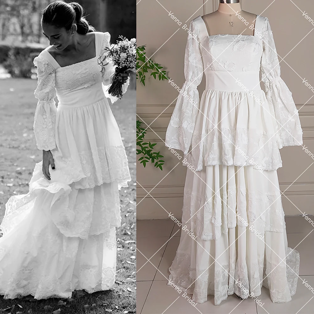 Long Billowing Sleeves Square Neck Bridal Gowns Retro Floral Lace A Line Tiered Princess Cotton Blend Customized Wedding Dress  Read more