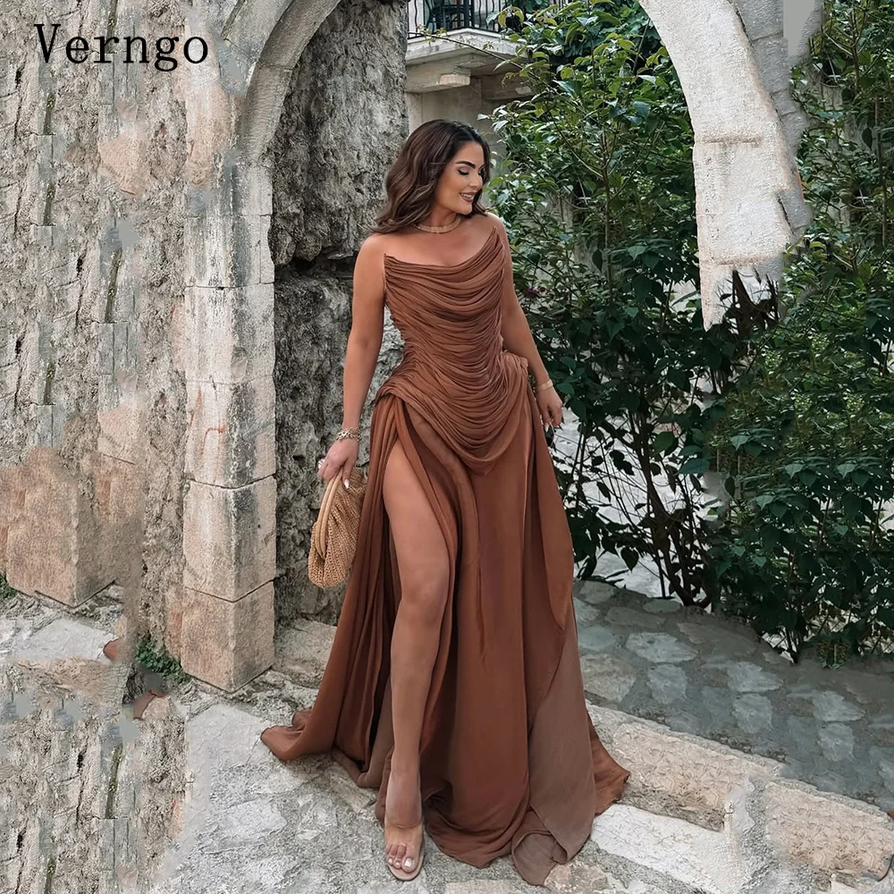 Verngo Brown Shiny Chiffon Evening Dress Strapless A Line Split Formal Occasion Dresses Sexy Prom Party Gowns Customized  Read more