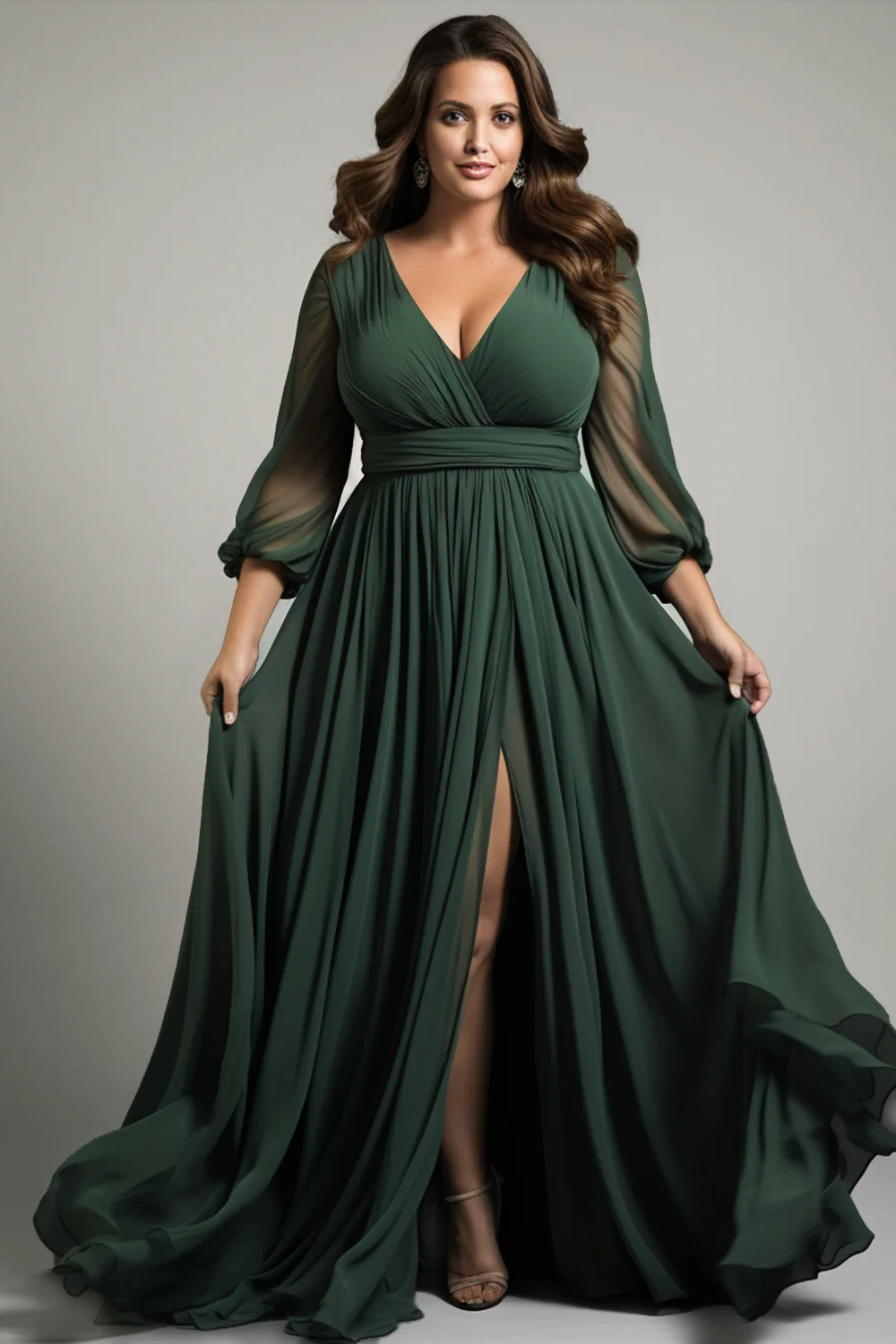Flycurvy Plus Size Mother Of The Bride Dark Green Chiffon Wrap Lantern Sleeve Split Maxi Dress
