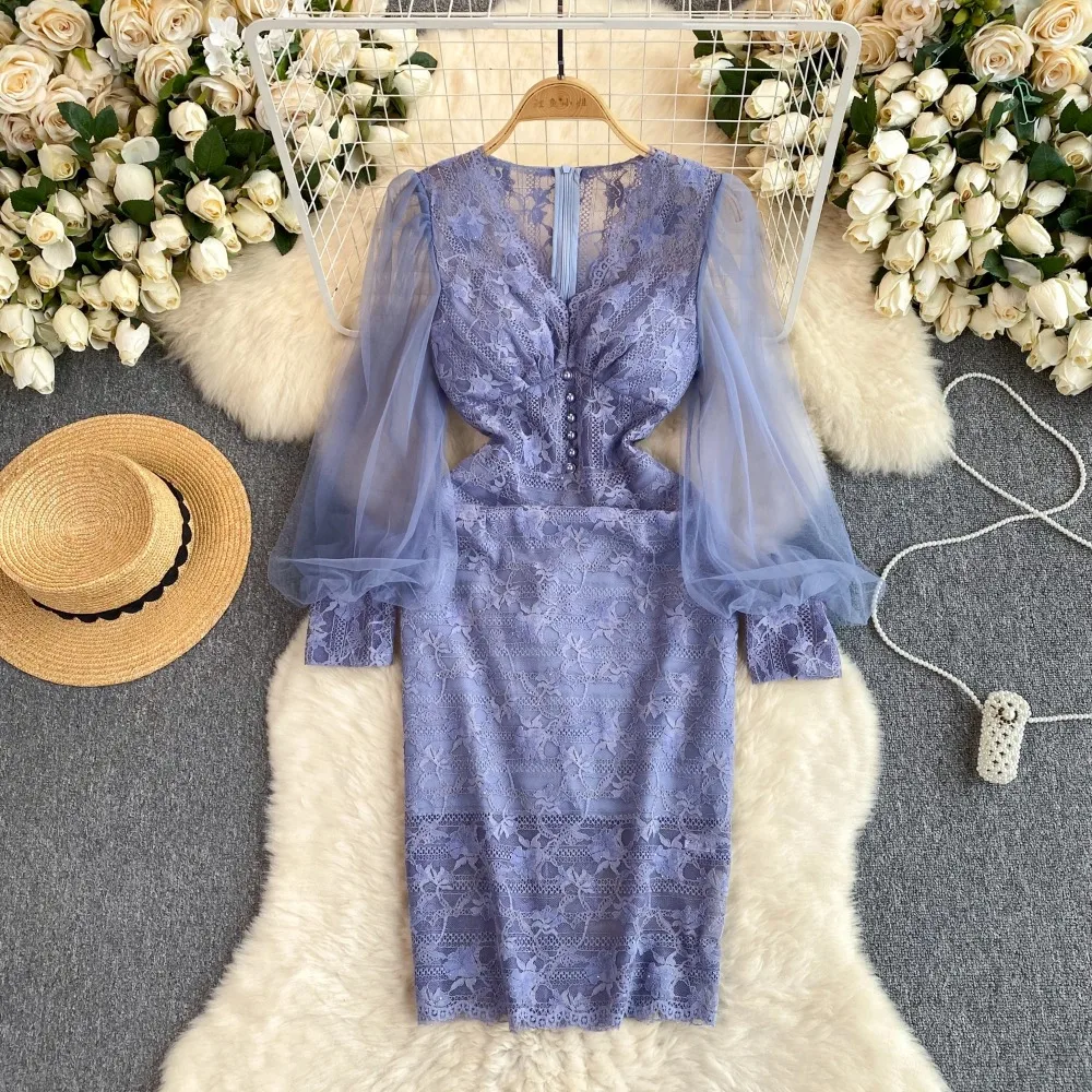 Retro lace Mesh Sheer Puff Sleeve v neck Chiffon sheer Dress Appear thin Women sexy Hip Wrap dresses