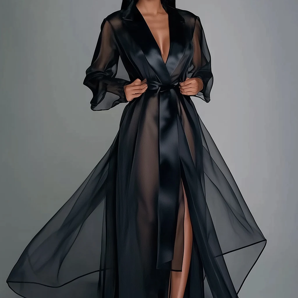 Women Maxi Dress Solid Organza See Through Lapel Long Sleeve Robe Summer Autumn Fashion Lace Up Gown Satin Silk Party Dress