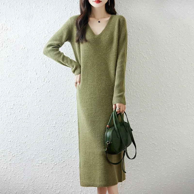 Fall/Winter 2025 New V-neck Solid Color Wool Knitted Dress Women's Loose Mid-length Pullover Simple Bottom Skirt
