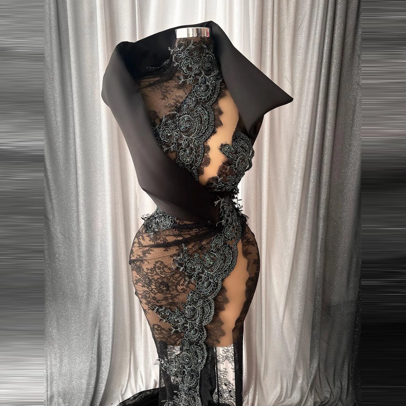 Sexy Black Lace Prom Dresses High Slit High Neck Illusion Mermaid Aso Ebi Evening Gowns For Black Girls Real Image See Thru  Read more