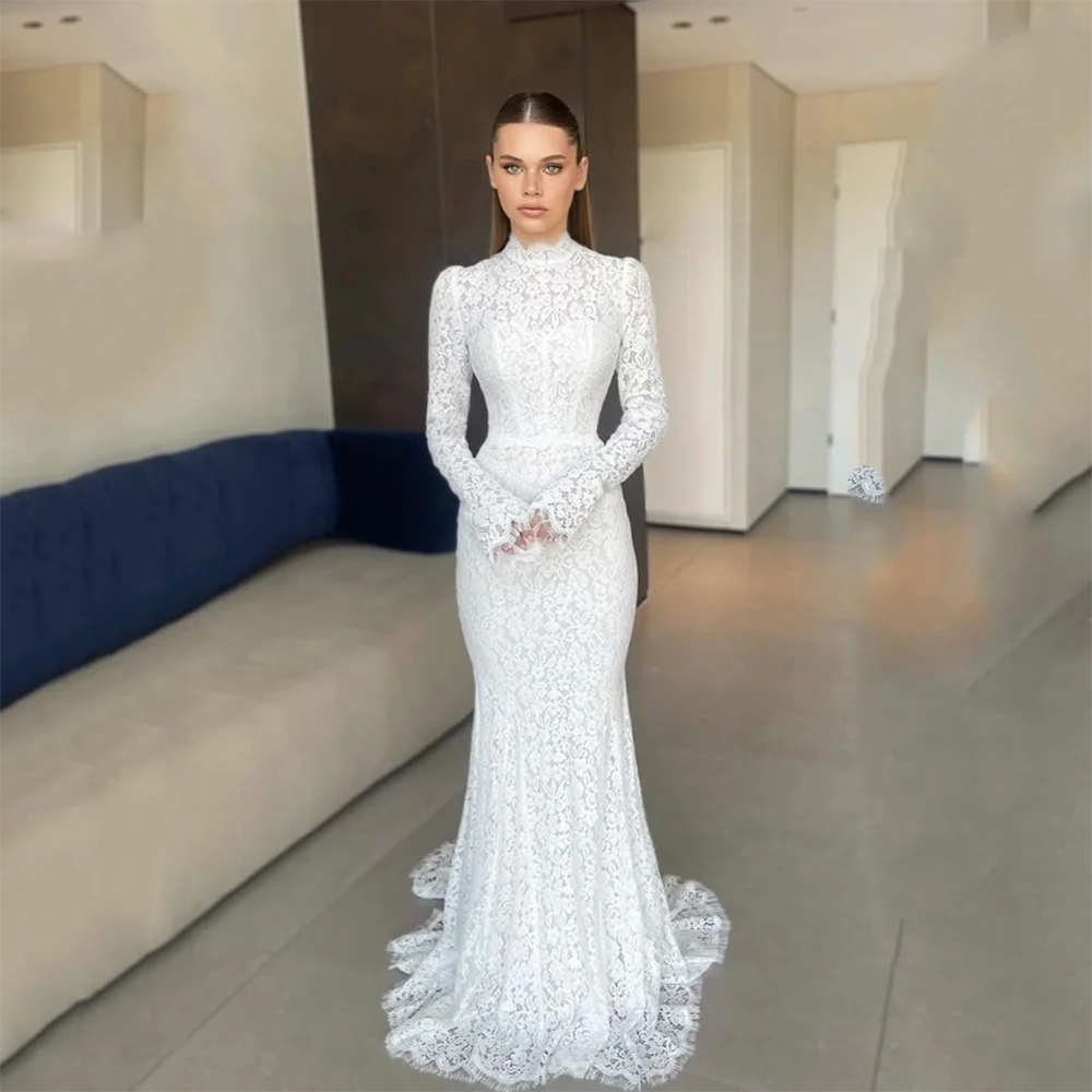 Verngo lvory Lace Wedding Dresses High Neck Full Sleeves Bridal Gowns Women Sweep Train Bride Dresses Customized