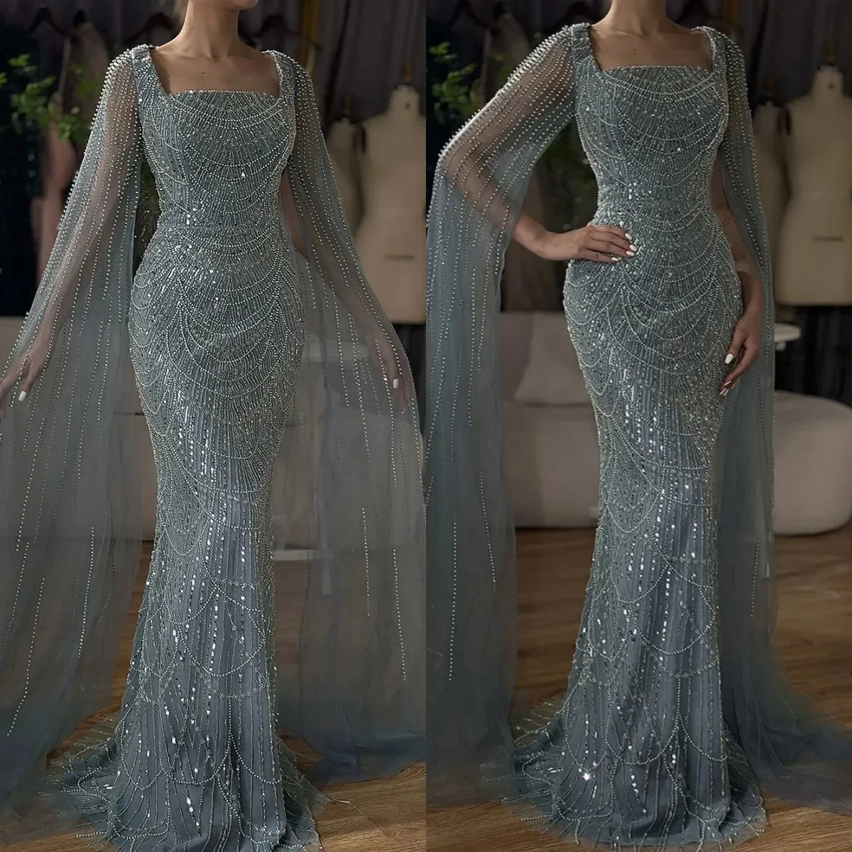 Unique Mermaid Evening Dress Beaded Sequins Beading Square Neck Prom Gowns Gorgeous Long sleeve Wrap Party Dresses Customized  Read more