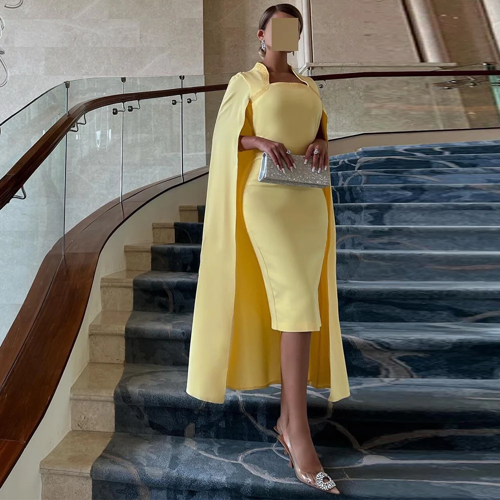 Elegant Long Beaded Cocktail Gowns 2025 Jersey Sheath/Column Beach Dress Pale Yellow Square Neck Beading Cloak Prom Gown Midi