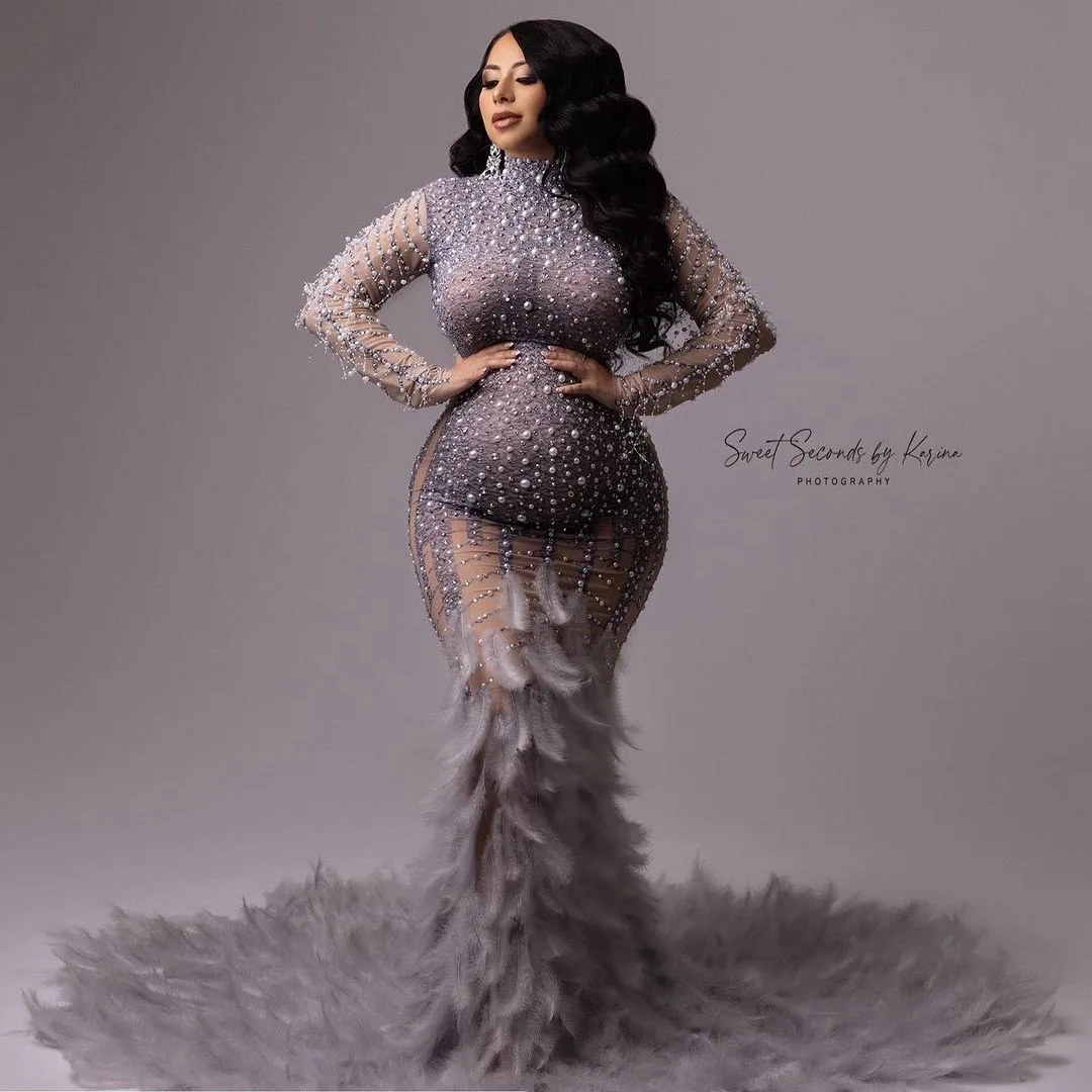 Glitter Beaded Maternity Gowns For Photo Shoot Sexy Crystal Diamond Mermaid Long Pregnant Dresses Women Feathers Mermaid Gown