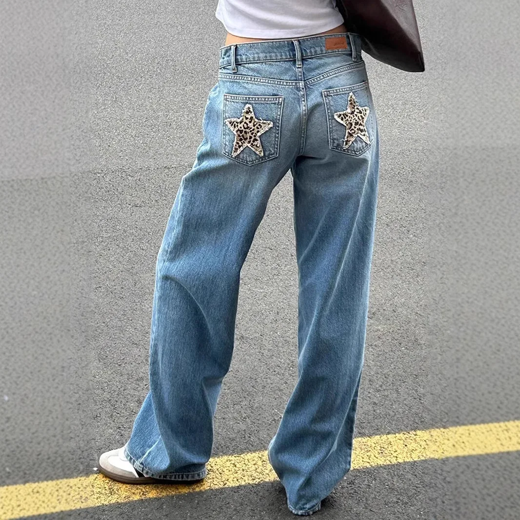 American Retro Street Leopard Stars Patch Patchwork Straight Jeans Women Loose Casual Pants Women Jeans Denim Straight Pants