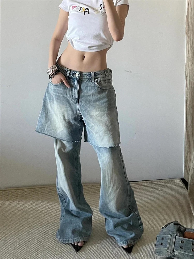 Women's Splicing Detachable Design Design Wide Leg Jeans Cool Girl Fashion Bottoms Loose Denim Trousers Female High Waist Pants