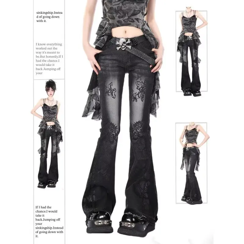 Women Shoujo Star Print Jean Y2k Japanese Harajuku Low Rise Patchwork Denim Flare Pants 2000s Kpop Bell-Bottom Long Trousers  Read more