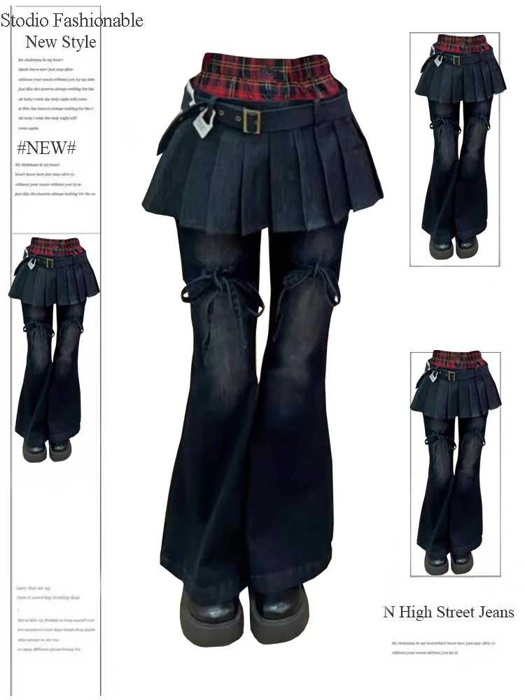 Autumn Winter Women's Denim Pants Slim Flared Jeans Fake Two Pieces Bell Bottom Jeans Abi Y2k Dark Academia Skinny Cyber Punk