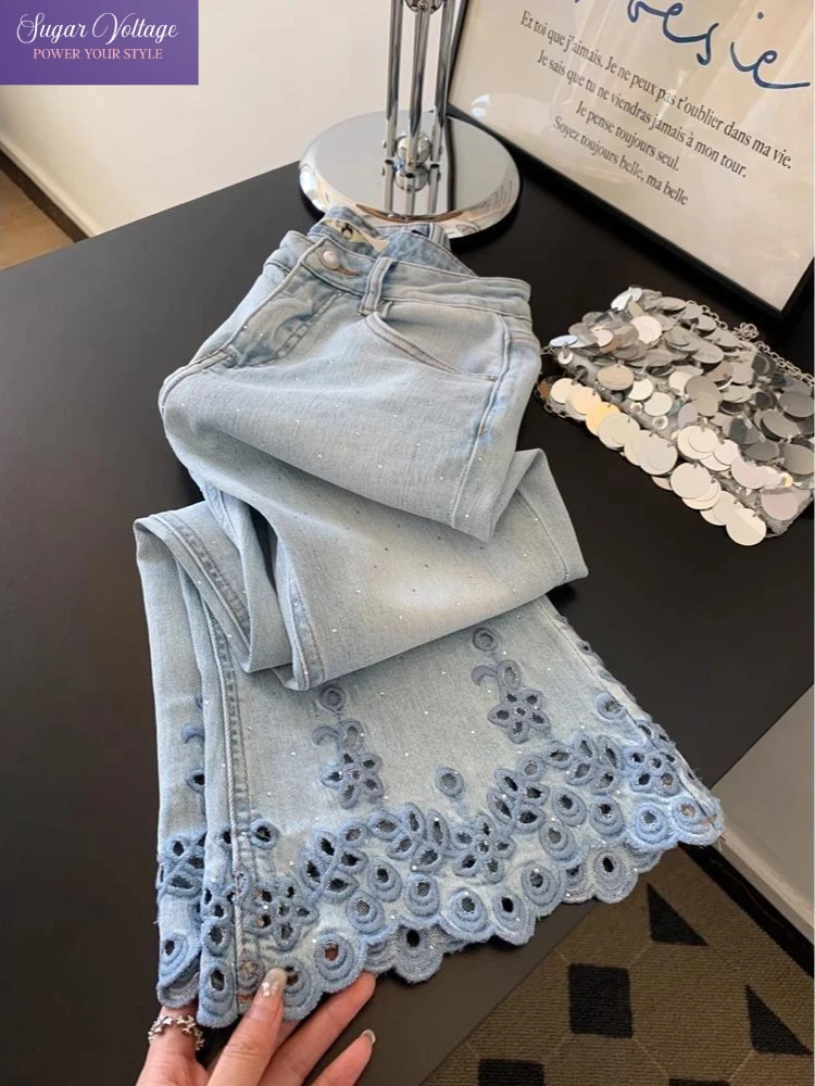 Elegant Luxury Loose Hollow Embroidered Rhinestone Jeans Women Summer High Waist Straight Denim Pants Y2K Casual Streetwear