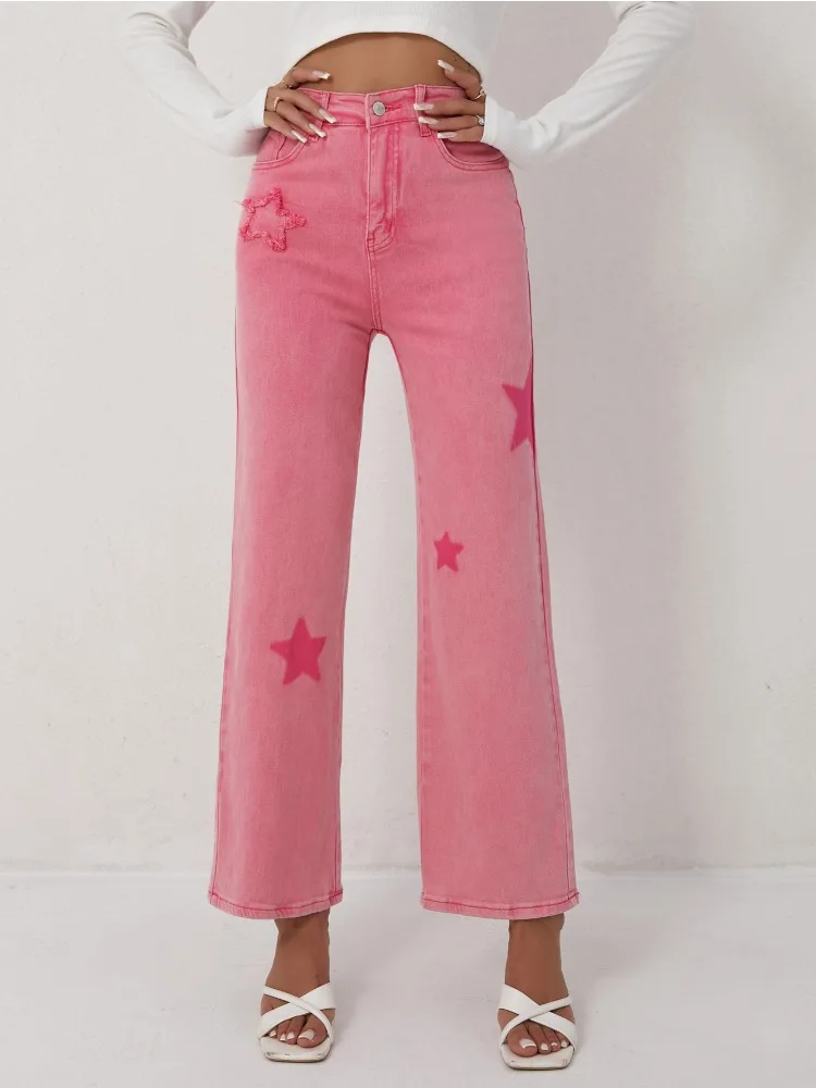 Women's Pink Jeans Star Print Flared High Waist Denim Trousers Stylish and Comfortable Outfit Option