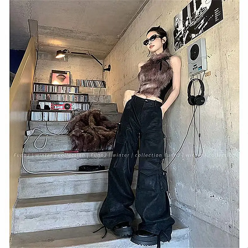 Y2K Black Cargo Pants for Women Straight Leg Jean Edgy Style Pocket Trousers Streetwear 2000s Aesthetic Grunge Pants Pantalones