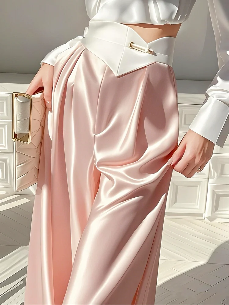 New High End Pink Satin Wide Leg Pants Women Summer Elegant Slim Patchwork High Waist Fashion Design Straight Trousers  Read more